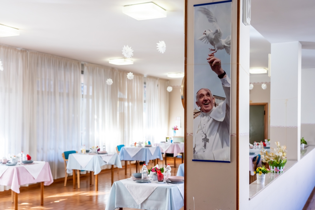 “Pensionato San Francesco” si sviluppa all’interno di un edificio di quattro piani: due sono adibiti alle stanze per gli ospiti, due alle attività comuni.